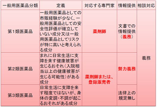 第一類医薬品は,薬剤師が必ず説明した上で販売しますが,第二類,第三類医薬品についは,薬剤師だけではなく「登録販売者」も適切な情報提供や相談対応をして販売するようになります. |