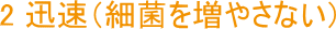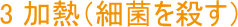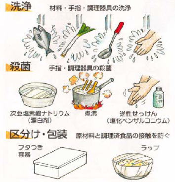 | 食中毒の原因となる細菌やウィルスは、私たちの周りのどこにでもいます。食中毒の予防の基本は、「つけない」「増やさない」「やっつける」です。特に「つけない」「増やさない」は大事です。毒素を出す細菌では、「加熱」して細菌を「やっつけて」も黄色ブドウ菌のように熱によっても分解されない毒素をつくるものやセレウス菌のように芽胞を作って生存するため、熱に抵抗性があり、100℃27〜31分間(米飯中では、22〜36分)の加熱を必要とするものもあります。十分に注意して「つけない」「増やさない」を実践しましょう。 | |||||||