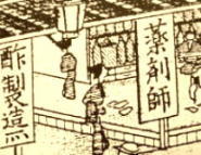 | 薬剤師、薬局の名称 は 明治22年の「薬品営業並薬品取締規則」で制定された。当時、薬剤師の看板が目立った。 |