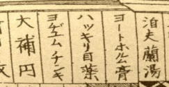 薬品は西洋薬もチラホラ ヨードホルム、ヨードチンキ、セメンエン虫下し (サントニン)や西洋人処方薬(ビットル散)、 ウルユスは洋薬のように見せかけるカタカナ 薬名で江戸時代後半から出はじめた。 烏犀圓、朝鮮奇応丸は江戸時代からの佐賀 の名薬 |